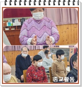 예배당에 들어간 후 요양원 어르신들과 반갑게 인사를 나누며 예배 준비 시간으로 찬송가를 부르는 시간에 박수를 치며 즐겁게 ..