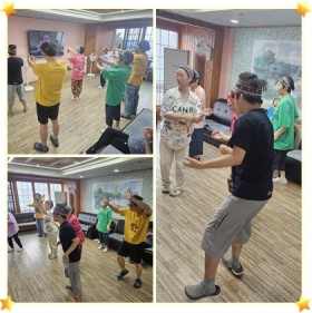 빙글 빙글 영상과 함께 노래를 따라 부르며 부드러운 동작을 해보는 시간이었습니다. 줌바 티와 머리띠 선글라스로 멋을 내고 ..