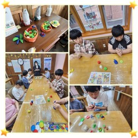 추석 때 먹었던 음식을 회상하며 클레이로 음식을 만들었습니다.만들기 전 여러 음식이 있는 사진을 보여주며 추석 때 먹었던 ..